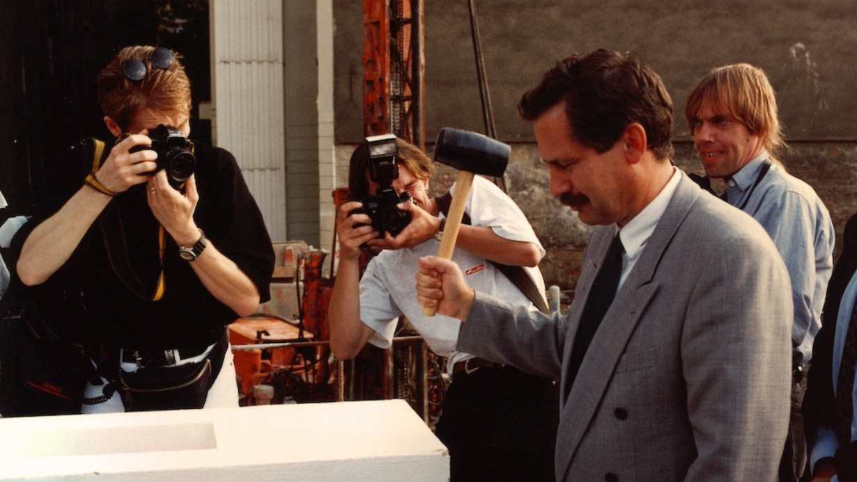 The exhibition also presents original objects from the building’s early interior design phase, including glass tables by architect Eva Jiřičná, doors, lighting elements and office furniture used after the building opened.