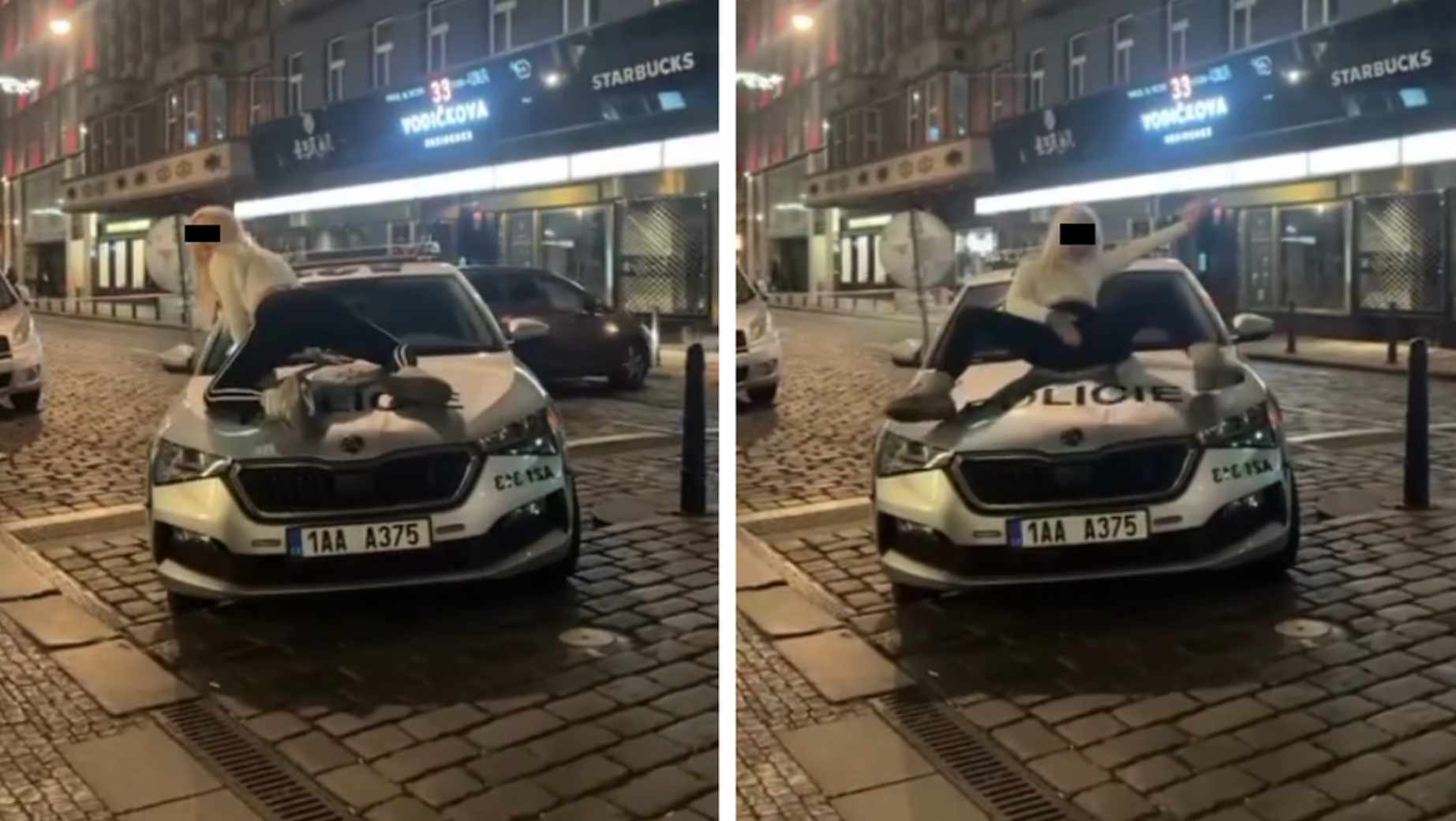 Police say a 26-year-old damaged a police car on Vodičkova Street, just outside the Lucerna arcade, after climbing onto the vehicle and posing for a camera held by her friend.